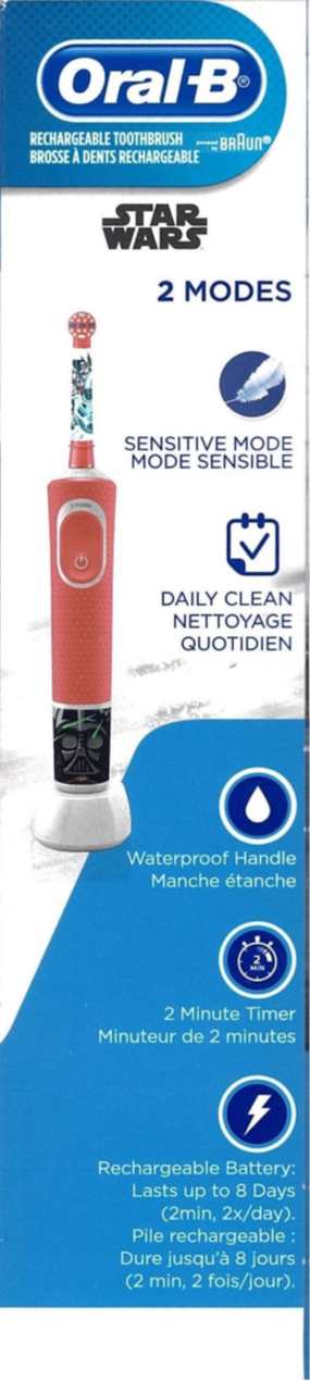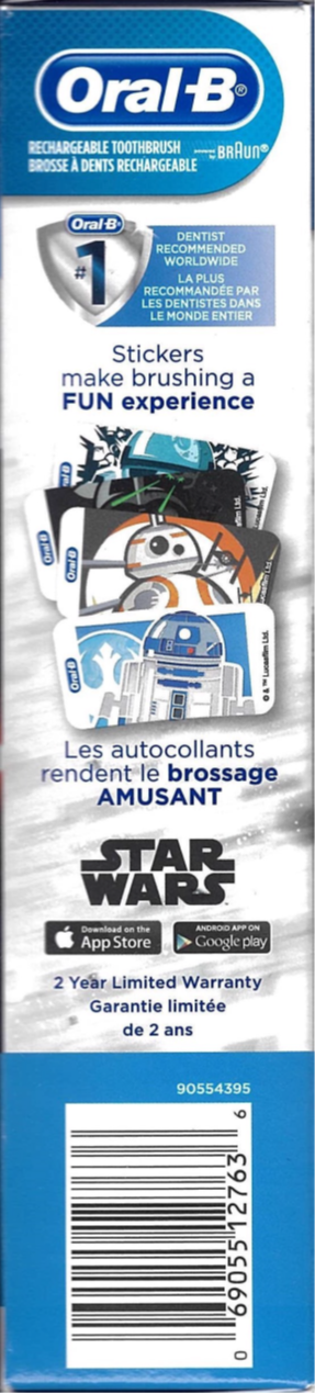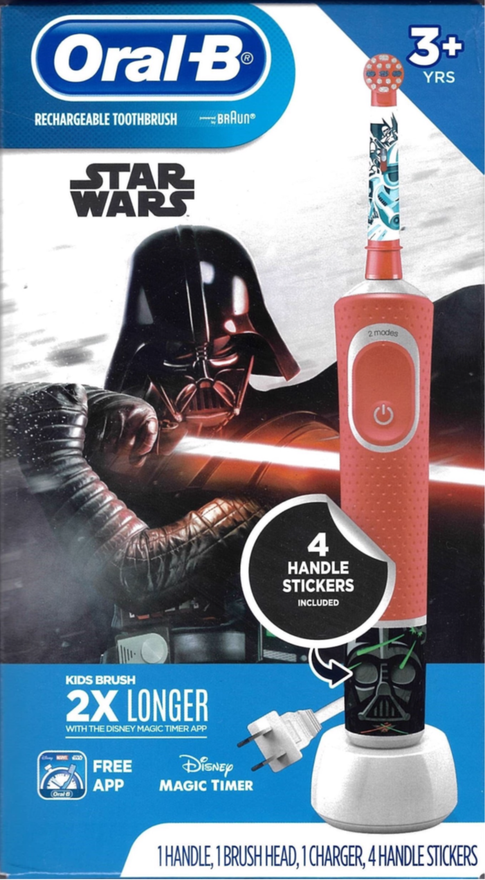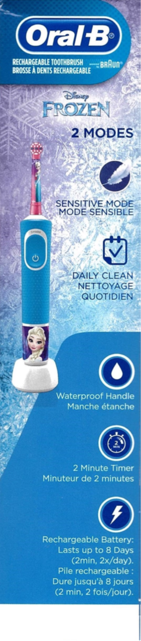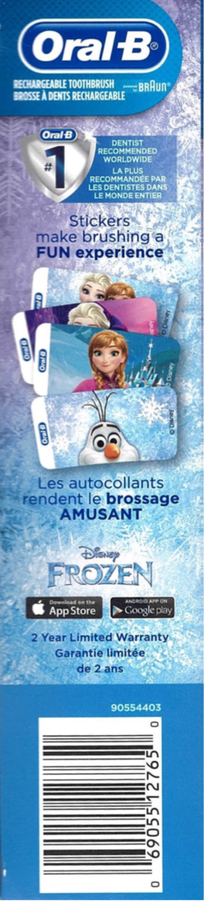 Oral B kids rechargeable toothbrush includes: 1 handle, 1 brush head, 1 charger, 4 handle stickers, 1 Kid’s Crest 100mL toothpaste, 1 Crest 500 mL Anti-cavity fluoride rinse and a reusable bag